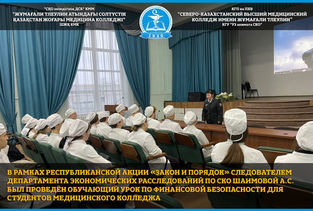 03 декабря 2025 года в рамках республиканской акции «Закон и порядок» следователем Департамента экономических расследований по СКО Шаимовой А.С. был проведён обучающий урок по финансовой безопасности для студентов медицинского колледжа.