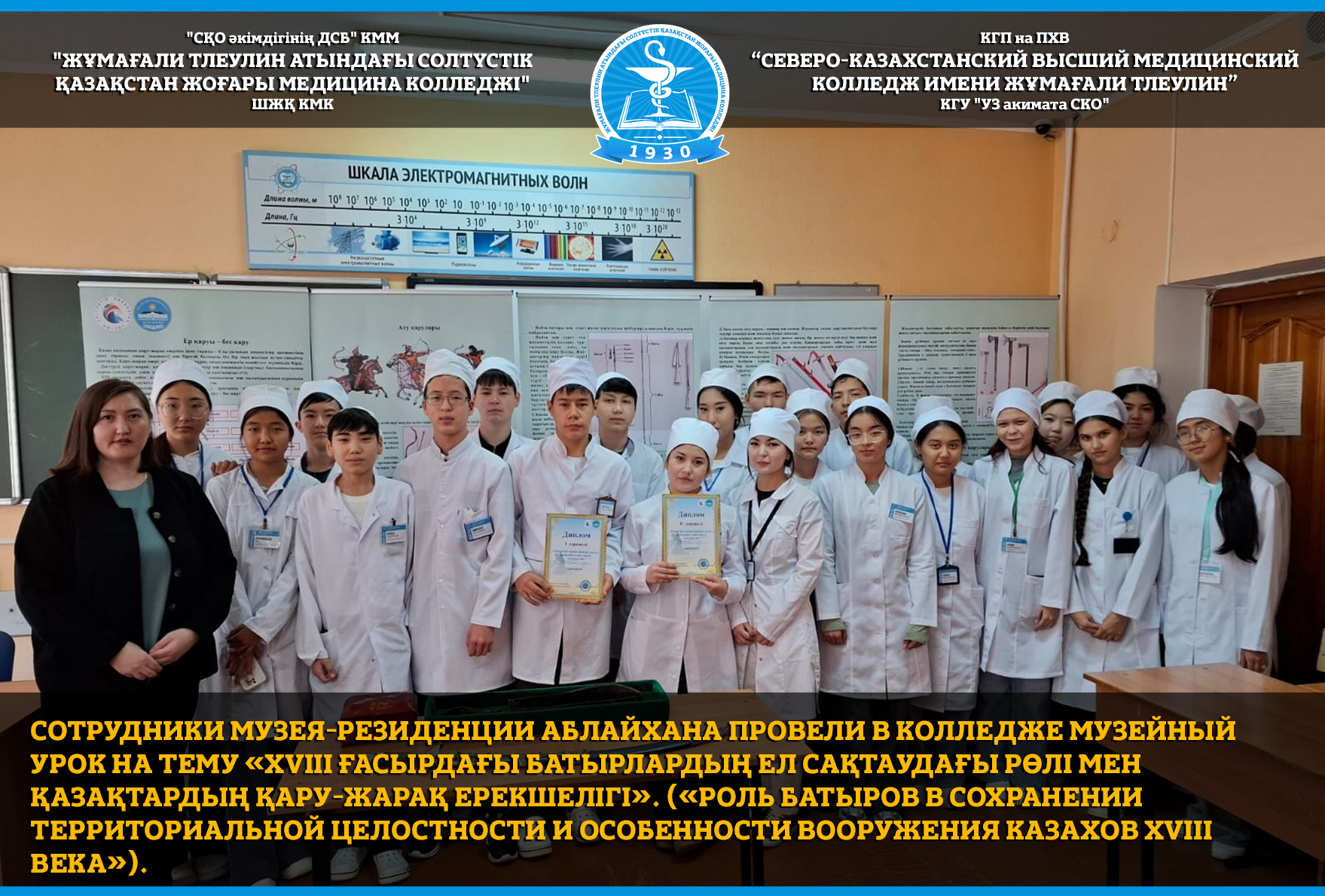 Сотрудники музея-резиденции Аблайхана провели в колледже музейный урок на тему «XVIII ғасырдағы батырлардың ел сақтаудағы рөлі мен қазақтардың қару-жарақ ерекшелігі». («Роль батыров в сохранении территориальной целостности и особенности вооружения казахов XVIII века»). В ходе мероприятия студенты первого курса группы М25-01к не только узнали много нового, но и поучаствовали в интеллектуальной игре, в которой, кончно-же победила дружба. Такие мероприятия не только расширяют кругозор, но и способствуют влпюспитанию гражданственности и патриотизма