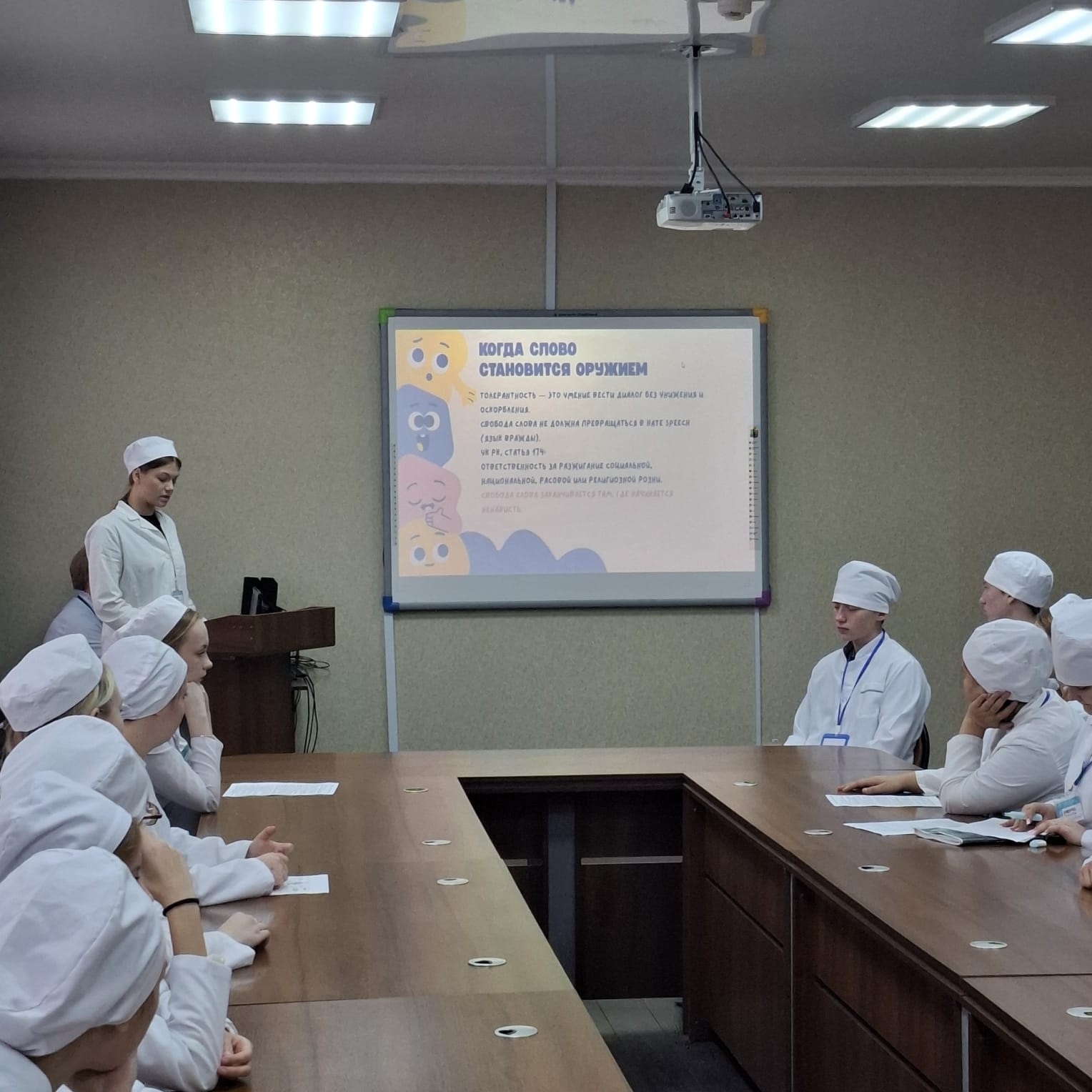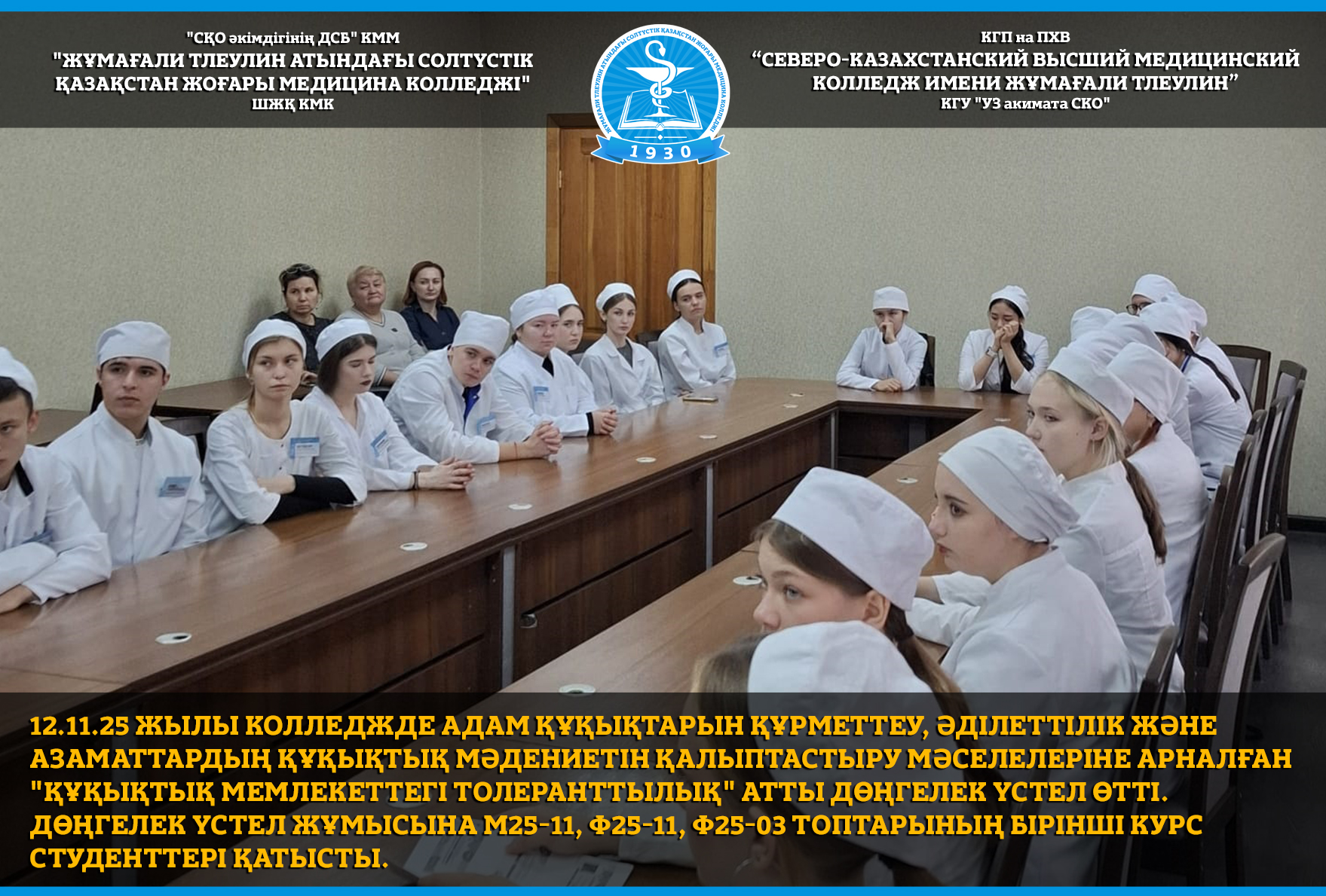 12.11.25 жылы колледжде адам құқықтарын құрметтеу, әділеттілік және азаматтардың құқықтық мәдениетін қалыптастыру мәселелеріне арналған "Құқықтық мемлекеттегі толеранттылық" атты дөңгелек үстел өтті. Дөңгелек үстел жұмысына М25-11, Ф25-11, Ф25-03 топтарының бірінші курс студенттері қатысты.