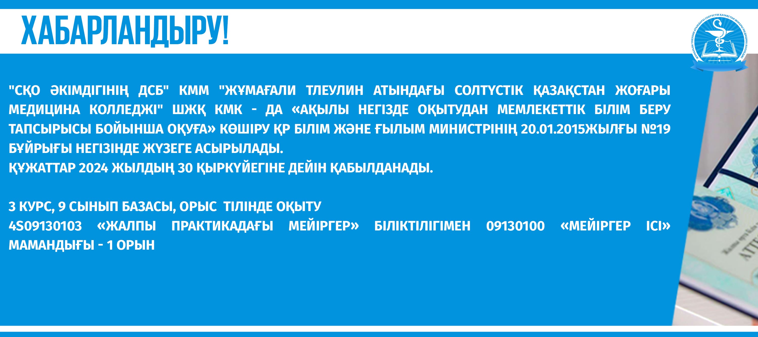 Солтүстік Қазақстан облысының МСАК орта медицина қызметкерлерін үш жылға дейін еңбек өтілімен оқыту.