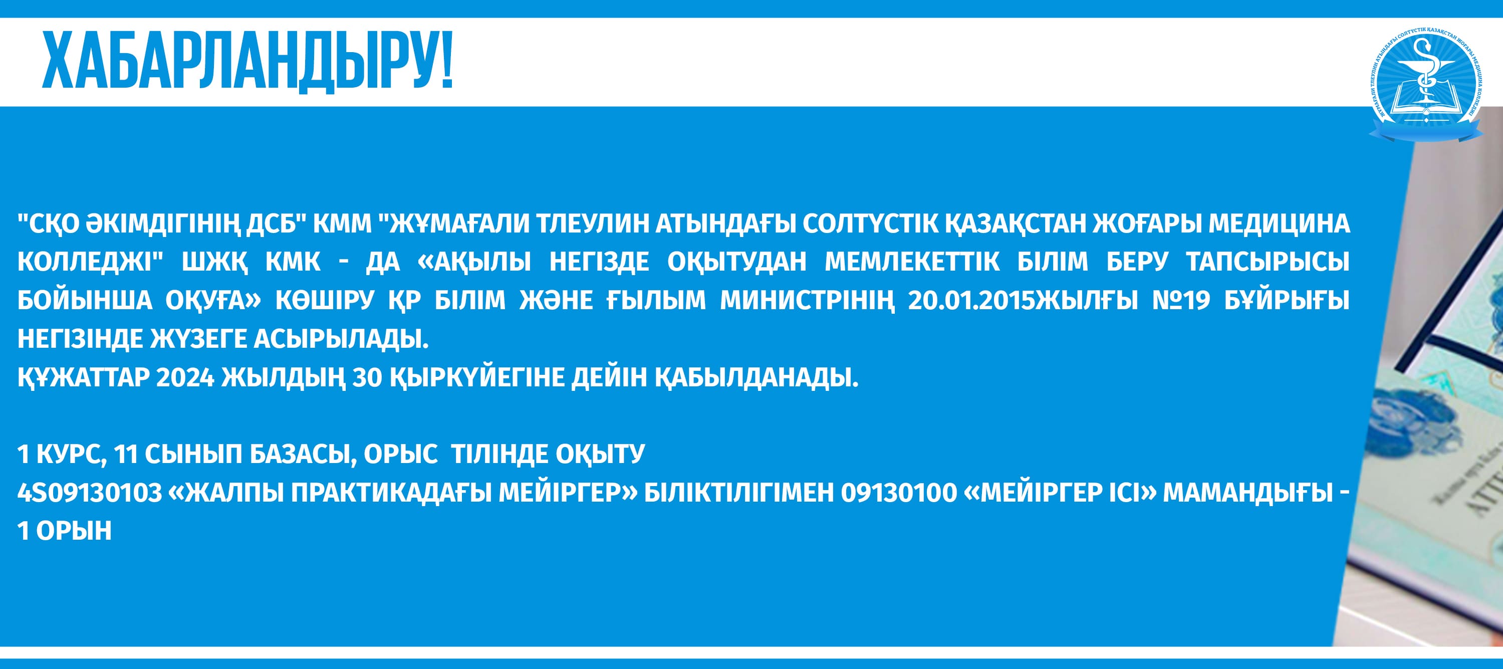 "СҚО әкімдігінің ДСБ" КММ "Жұмағали Тлеулин атындағы Солтүстік Қазақстан жоғары медицина колледжі" ШЖҚ КМК