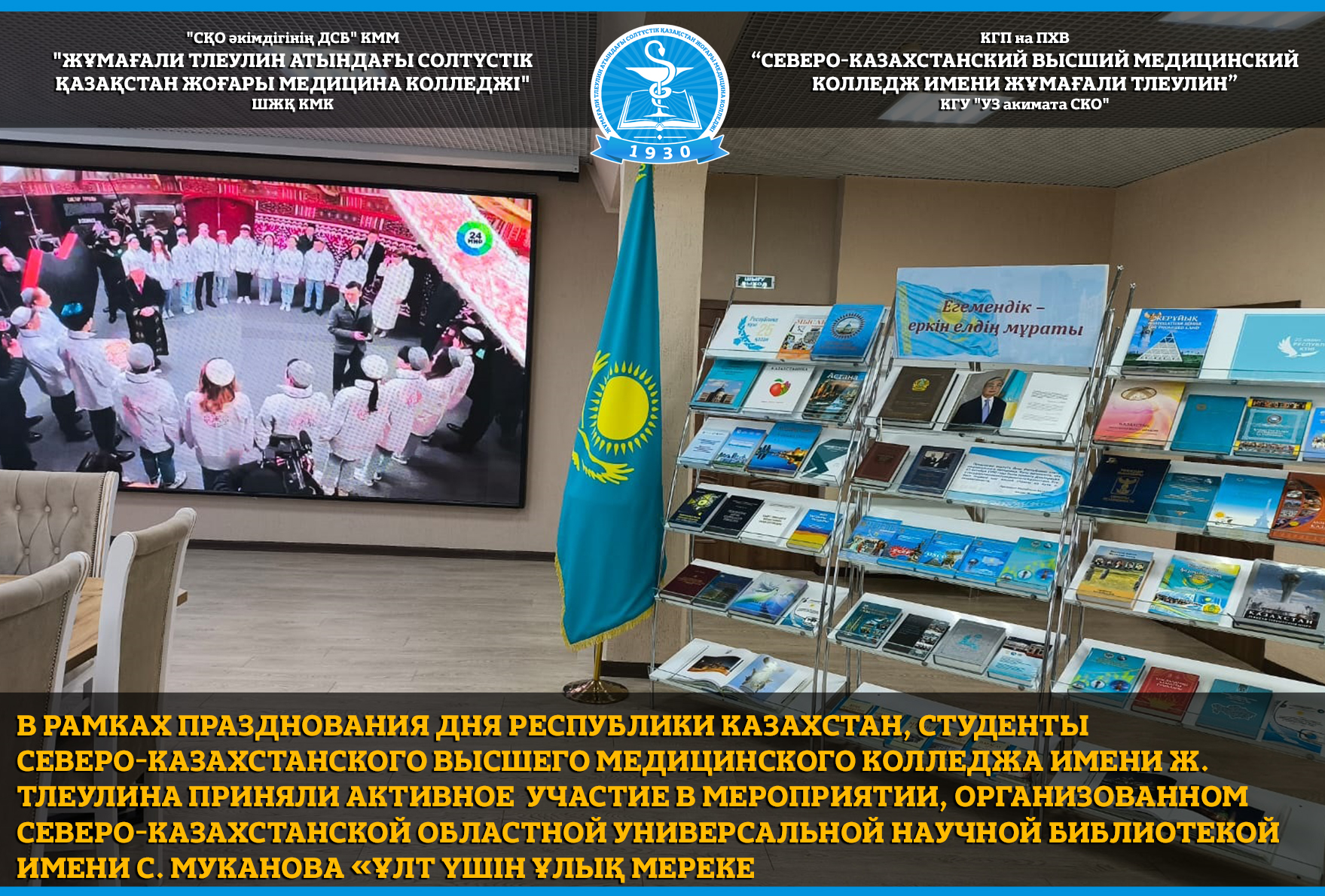 В рамках празднования Дня республики Казахстан, студенты Северо-Казахстанского высшего медицинского колледжа имени Ж. Тлеулина приняли активное участие в мероприятии, организованном Северо-Казахстанской областной универсальной научной библиотекой имени С. Муканова «Ұлт үшін ұлық мереке»