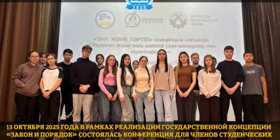 13 октября 2025 года в рамках реализации государственной концепции «Закон и порядок» состоялась конференция для членов студенческих клубов «Саналы ұрпақ», а также студентов первого курса на тему «Студент и закон: актуальные вызовы и возможности».