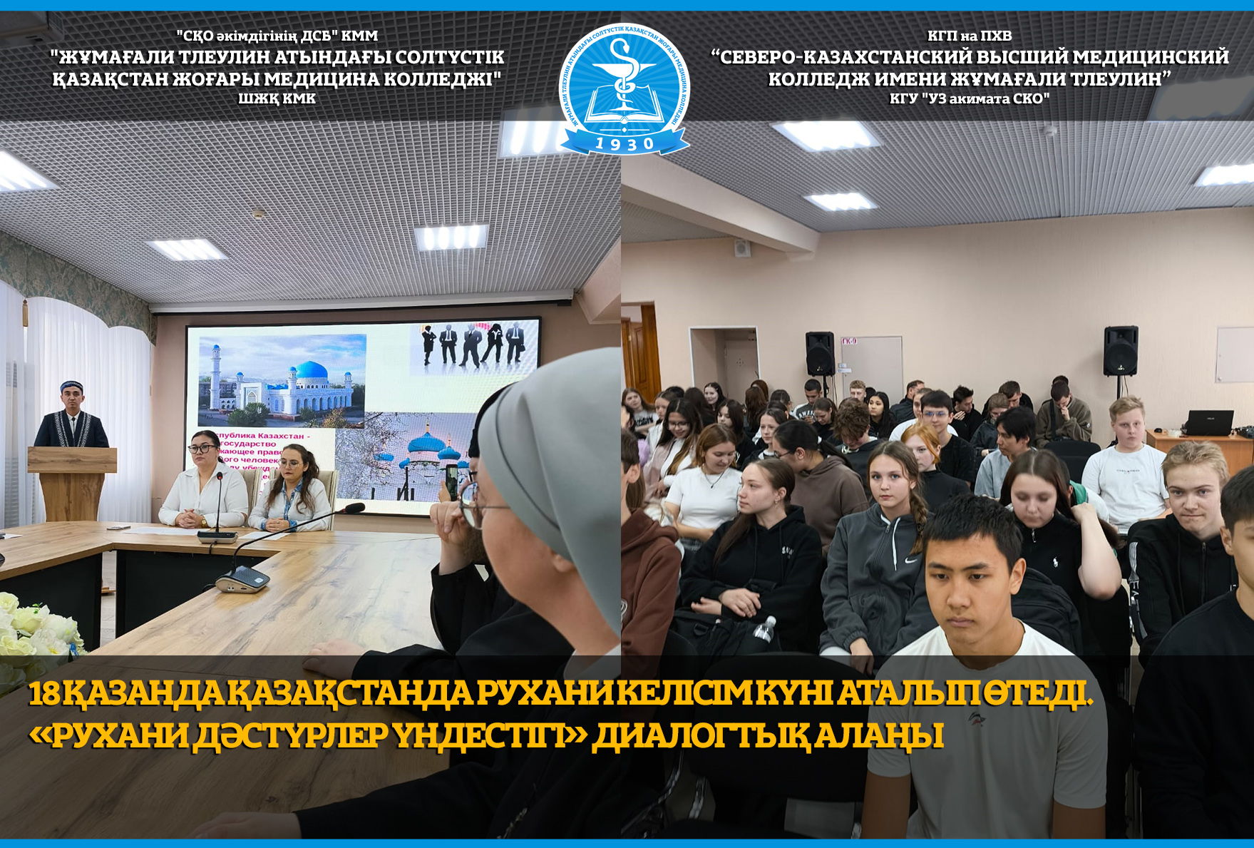 2025 жылдың 18 қазанында медициналық колледждің студенттері Сабит Мұқанов атындағы ғылыми кітапханаға барып, «Рухани дәстүрлер үндестігі» атты диалог алаңына белсенді түрде қатысты. Бұл іс-шараның мақсаты – Қазақстан халқының рухани құндылықтарын нығайту арқылы елдің одан әрі бейбіт әрі табысты дамуына үлес қосу.