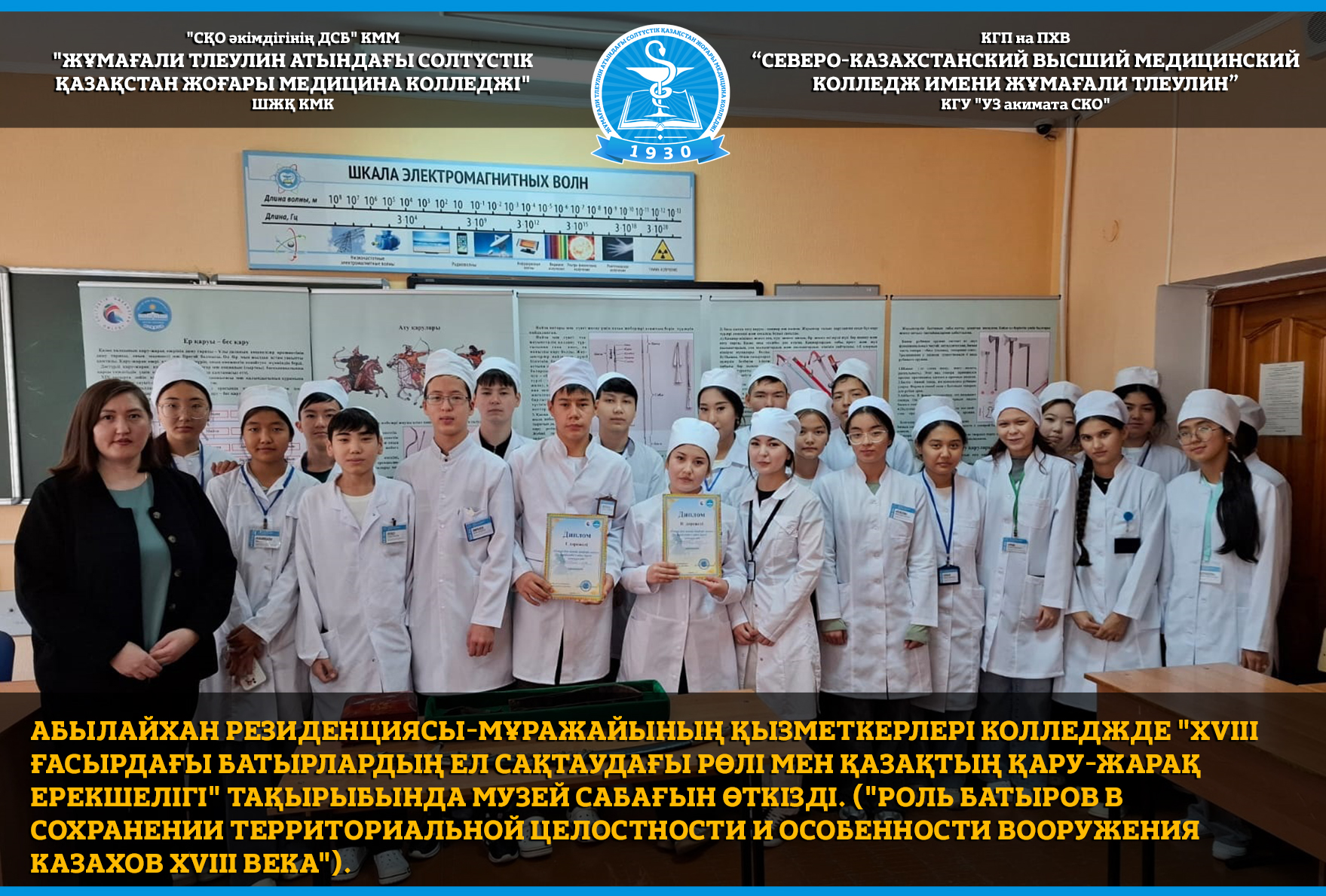 Абылайхан резиденциясы-мұражайының қызметкерлері колледжде "XVIII ғасырдағы батырлардың ел сақтаудағы рөлі мен қазақтың қару-жарақ ерекшелігі" тақырыбында музей сабағын өткізді. ("Роль батыров в сохранении территориальной целостности и особенности вооружения казахов XVIII века"). Іс-шара барысында М25-01к тобының бірінші курс студенттері жаңа мәліметтермен танысып қана қоймай, зияткерлік ойынға да қатысып, онда, әрине, достық жеңіске жетті. Мұндай іс-шаралар ой-өрісін кеңейтіп қана қоймай, азаматтық пен патриотизмді қалыптсатыруда ықпал етеді