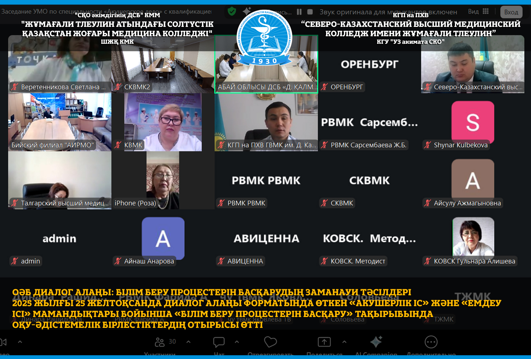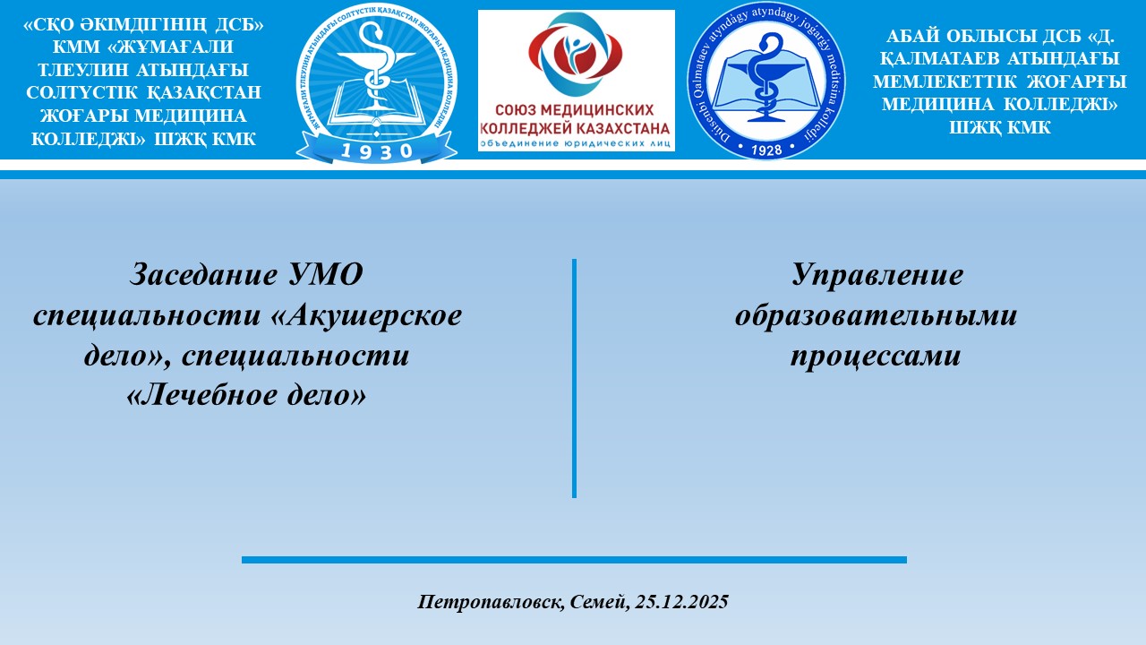 2025 жылғы 25 желтоқсанда диалог алаңы форматында өткен «Акушерлік іс» және «Емдеу ісі» мамандықтары бойынша «Білім беру процестерін басқару» тақырыбында оқу-әдістемелік бірлестіктердің отырысы өтті. Іс-шара Қазақстан Республикасы мен Ресей Федерациясының медицина колледждерінің өкілдерін біріктірді және кәсіптік білім беруді жаңғырту жағдайында медицина мамандарын даярлау сапасын арттырудың өзекті мәселелерін талқылауға бағытталған.